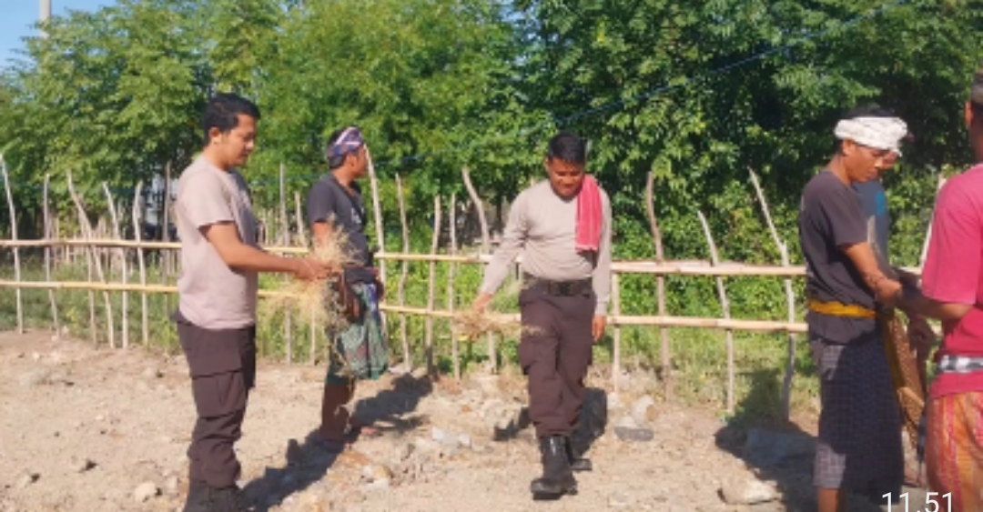 Bakti sosial religi dipimpin Kapolsek Poto Tano IPDA Abdul Gafir bersama anggota. Menyambut hari Bhayangkara ke-78 seluruh personel Polsek Poto Tano melakukan bersih-bersih di halaman pura dan perbaikan pagar keliling pura.