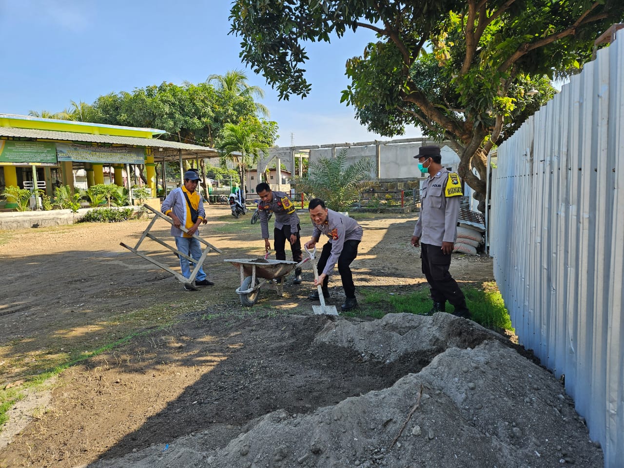 “Kegiatan yang di lakukan kali ini adalah bergotong royong membersihkan halaman masjid dan memindahkan pasir bangunan untuk membangun tempat tinggal Marbot masjid Jami’ Nurul Iman,” kata Kapolsek.