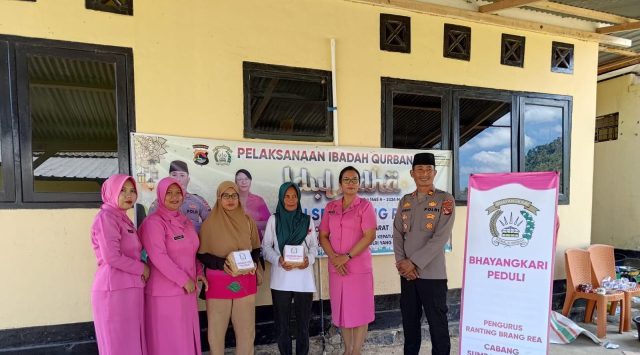 Harian NTB, Sumbawa Barat | Kapolsek Brang Rea IPTU I Wayan Denny Suprapto beserta anggota dan Ketua Ranting Bhayangkari bersama anggota melaksanakan pembagian hewan kurban secara simbolis bagi masyarakat.