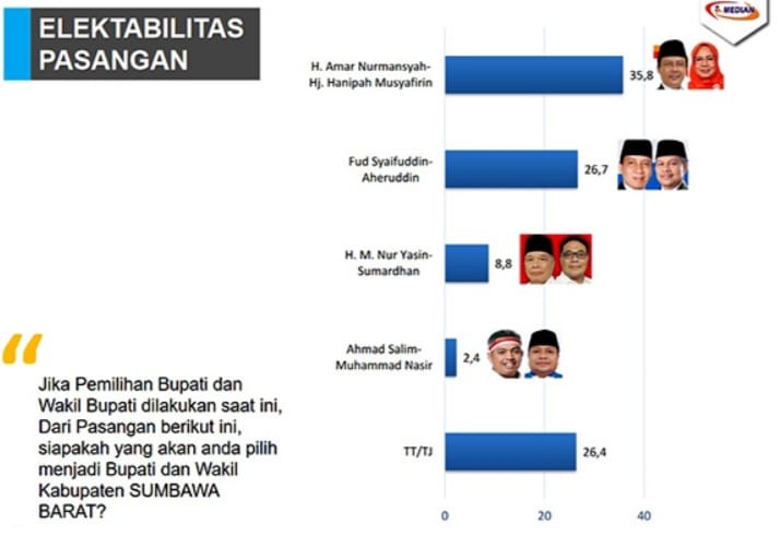 Elektabilitas calon bupati Amar Nurmasyah bertengger di peringkat pertama dengan 35,4 persen, disusul Fud Syaifudin 27 persen, Nur Yasin 8,8 persen, Ahmad Salim 2,4 persen, dan 26,4 persen tidak menjawab.